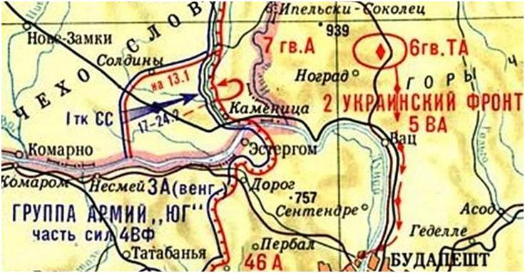 9 января 1945 года. Дивизии 2-го Украинского фронта переправились на западный берег реки Грон, правого притока Дуная, и отбросили немцев и мадьяр, закрепившись на Гронском плацдарме и обороняя его до 24 февраля включительно. Чем обеспечили ликвидацию окружённой в Будапеште группировки противника.