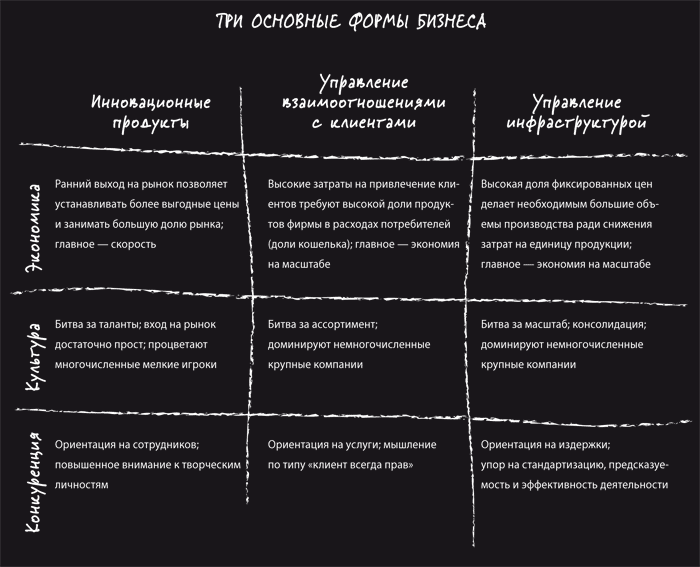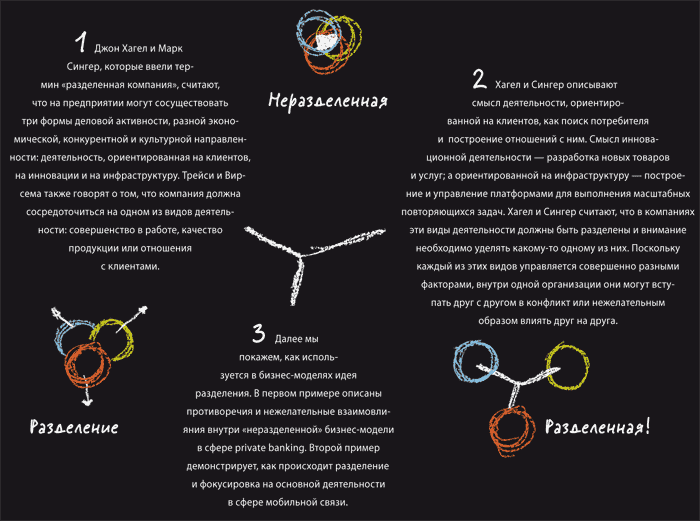 Концепция «разделения» предполагает наличие трех фундаментальных форм бизнес-деятельности: бизнес, ориентированный на клиентов, бизнес, ориентированный на инновации, и бизнес, ориентированный на инфраструктуру. • У каждой формы свои экономические, конкурентные и культурные правила. • Три формы деятельности могут сосуществовать в пределах одной компании, но в идеале они должны быть «разделены» с целью исключения конфликтных ситуаций или нежелательного влияния.