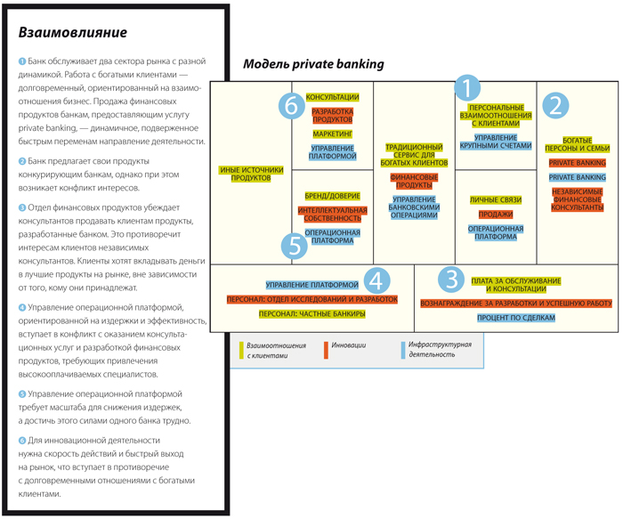 На следующей странице представлена традиционная модель бизнеса private banking, описаны взаимовлияния и показано разделение модели на три вида деловой активности: управление взаимоотношениями с клиентами, инновации и управление инфраструктурой.
