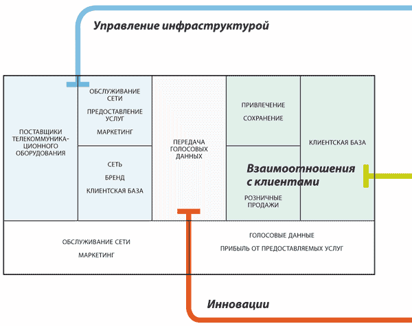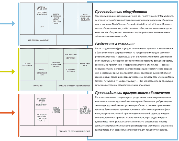 Телекоммуникационные компании также проводят разделение бизнеса. Традиционно конкуренция в этой области была ориентирована на качество сети, но теперь значительно возросло сотрудничество фирм, дробление сетей или даже полная передача сетевых операций производителям оборудования. Почему? Потому что сеть перестала быть основным активом этих компаний: главное – бренд и отношения с клиентами.