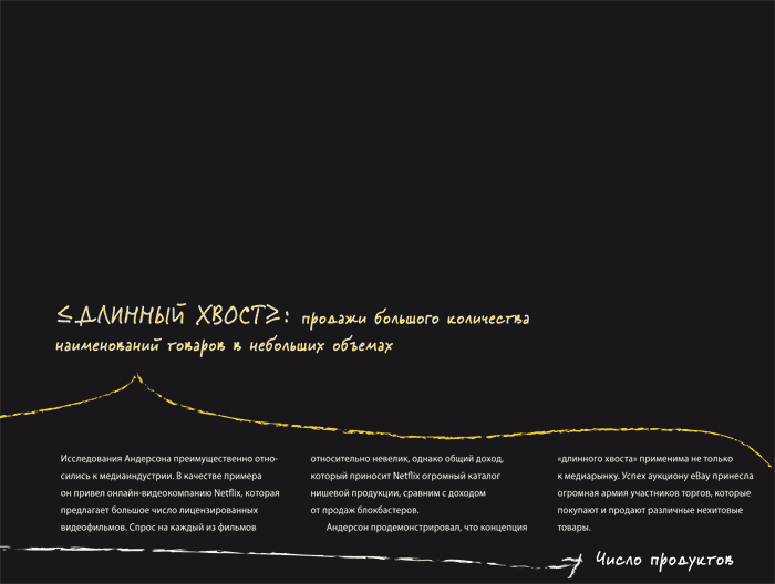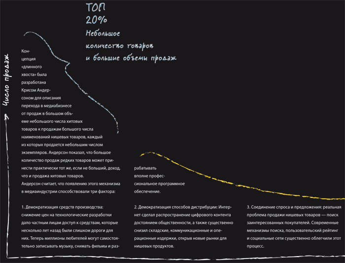 «ДЛИННЫЙ ХВОСТ» – это продажи многого понемногу: предложение большого количества нишевых товаров, каждый из которых продается относительно редко. • Комплексные продажи нишевых товаров могут быть столь же прибыльными, как и традиционная модель, где основной доход приносят продажи ограниченного количества бестселлеров. • Такие бизнес-модели требуют небольших складских издержек и прочной платформы для быстрой доставки покупателям интересующей их продукции.