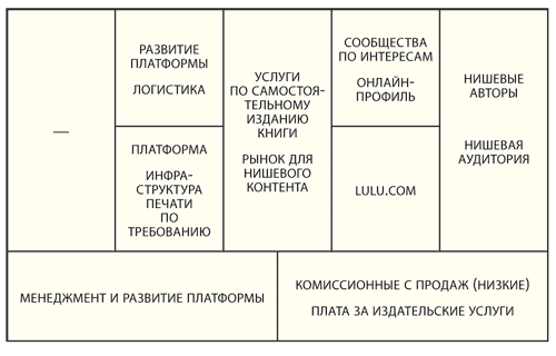 Lulu.com превратила традиционную издательскую модель в нечто совершенно иное, дав любому возможность быть опубликованным. Эта бизнес-модель дает возможность нишевым и непрофессиональным авторам вывести свои произведения на рынок. Она уничтожила входной барьер, предложив инструмент для издания через Интернет. Эта модель резко контрастирует с традиционной, ориентированной на отбор «рыночно выгодных» произведений. И чем больше авторов привлекает Lulu.com, тем большего успеха она добивается, так как авторы становятся клиентами. По сути, Lulu.com – многосторонняя платформа, которая связывает авторов и читателей друг с другом, накапливая «длинный хвост» созданного пользователями нишевого контента. Тысячи авторов используют для издания и продажи своих литературных произведений Lulu.com. Печать осуществляется только в ответ на конкретный запрос. Если книга не продается, для Lulu.com это не имеет никакого значения, поскольку компания денег в нее не вкладывала.