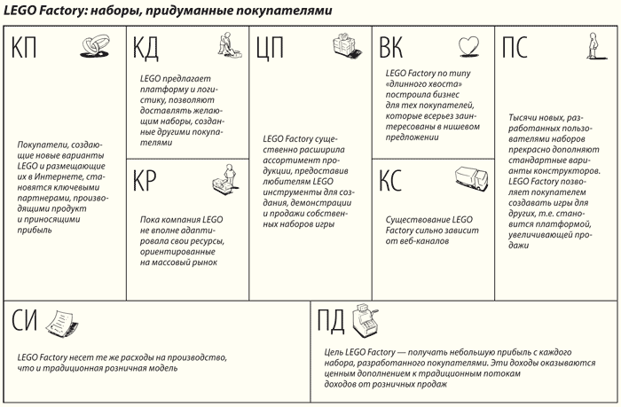 В 2005 г. LEGO начала экспериментировать с идеями клиентов. Так возникла LEGO Factory, которая позволяет покупателям создавать свои наборы LEGO и продавать их по Интернету. Используя программу LEGO Digital Designer, они могут воплощать в жизнь собственные модели и героев, выбирая то, что считают нужным, из тысяч деталей. И даже могут придумать дизайн коробки для своего набора. С помощью LEGO Factory компания превратила пассивных покупателей в активных участников дизайнерского процесса.