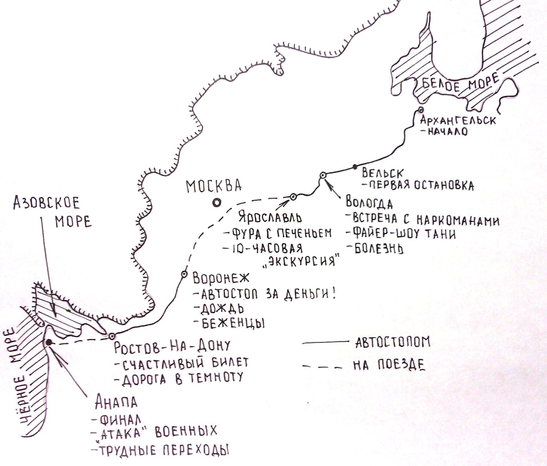 2. Часть вторая «Юг». Здесь приводится более подробное описание финального отрезка пути от Ярославля до Анапы, который был пройден автостопом, поездом и частично на своих двоих.