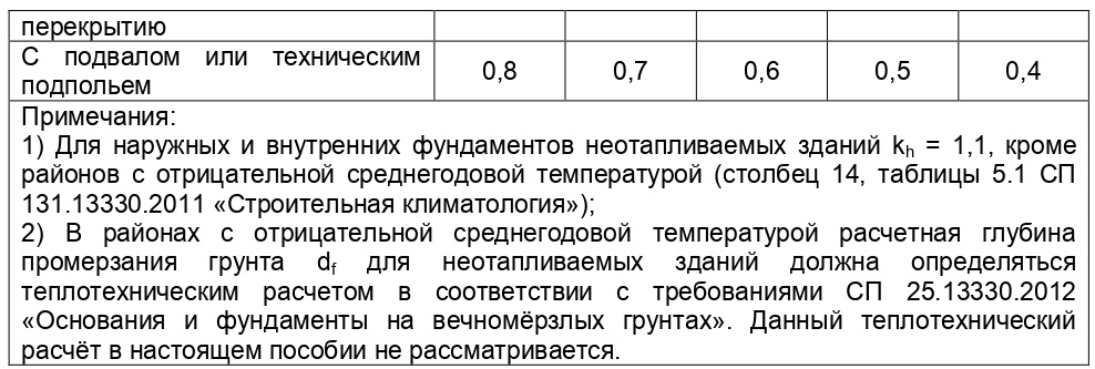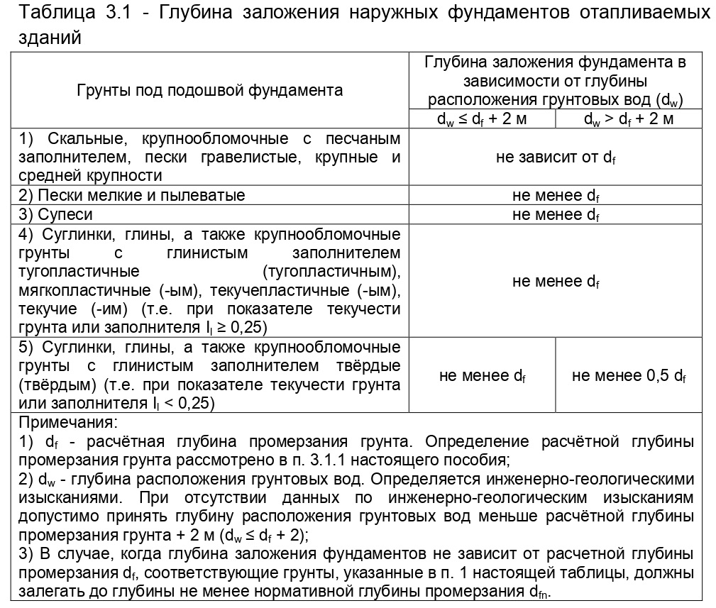 Согласно п. 5.5.5 СП 22.13330.2016 «Основания зданий и сооружений» глубина заложения наружных фундаментов отапливаемых зданий назначается по следующей таблице: