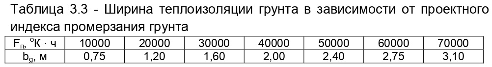 Таблица 3.3 – Ширина теплоизоляции грунта в зависимости от проектного индекса промерзания грунта