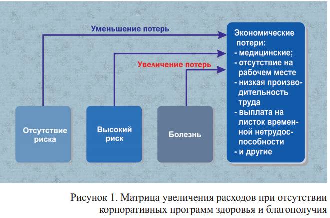 Ни для кого не секрет, что заболевания персонала приводят к потере трудоспособности. Однако важно не забывать, что не только заболевания, но и наличие факторов риска и угрозы здоровью, даже без наличия видимого заболевания, приводят к экономическим потерям в компании. Этот факт подтвержден исследованиями доктора Мичиганского университета Ди В. Эдингтона, из ведущей мировой организации в области здоровья на работе – Health Management Research Centre. Следует обратить внимание на некоторые выводы, которые были получены в других работах Ди В. Эдингтона и его коллег. Прежде всего это – сопряженность факторов риска с величиной экономических потерь компаний. Его исследования показывают, что прямые расходы на здоровье работников не так велики, но, с учетом косвенных расходов, становятся значительными. Работники, которые имеют низкий риск, «дешевле», чем люди со средним риском на 1200 долларов США, а с высоким риском – на 3000 долларов США.