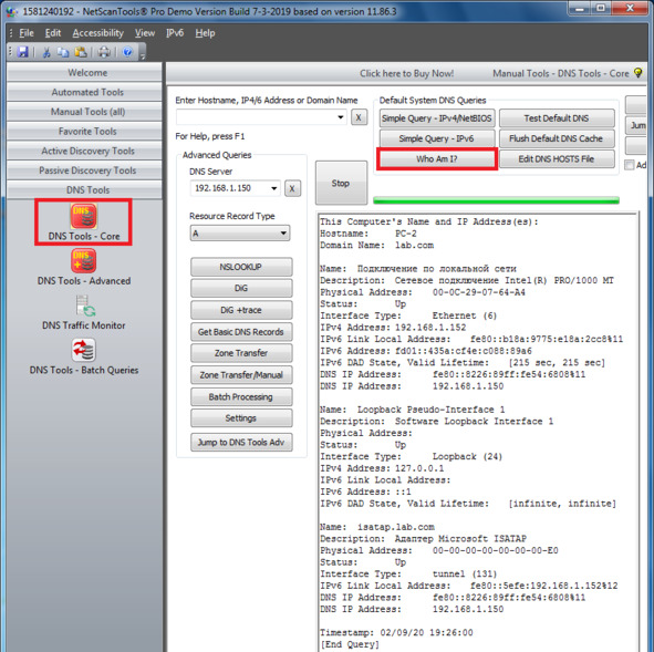 Сбор информации о сети будет производится с компьютера 2, чтобы узнать какую информацию о компьютере 1 можно получить удаленно. Для выполнения задачи используется программное обеспечение NetScanTools.