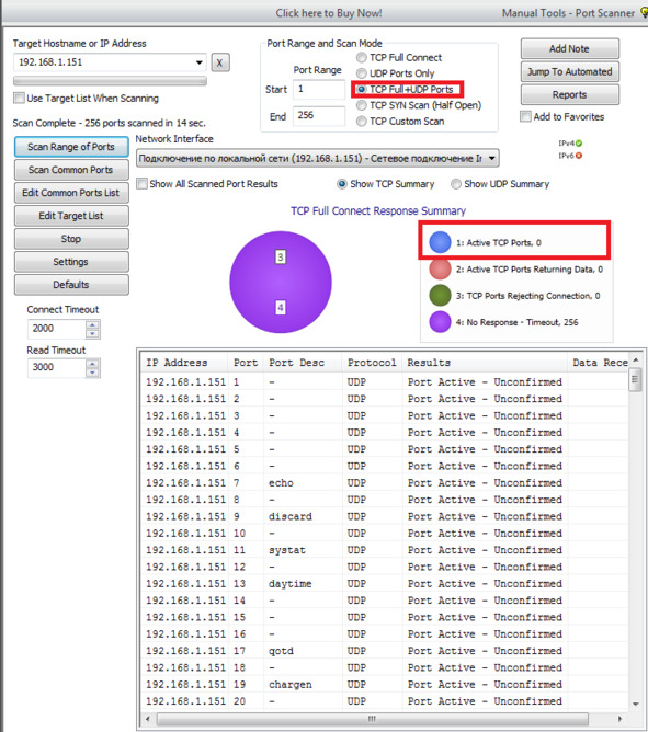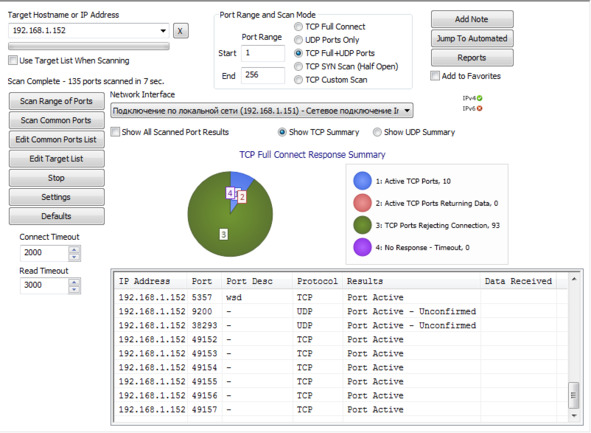 По результатам сканирования компьютера было выявлено 10 активных TCP-портов и 30 возможно активных UDP-портов.