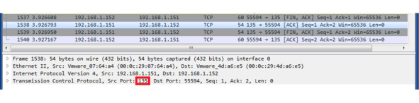 Порт 135 является открытым (рисунок 2.1). Компьютер в этом случае ответил пакетом FIN, ACK. FIN – флаг, который указывает на завершение соединения.