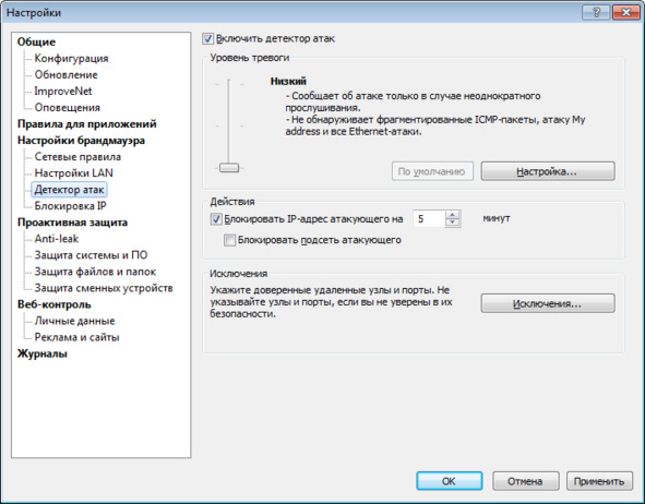 Также был использован программный межсетевой экран Outpost Firewall. Настроены правила для блокирования IP-адресов, созданы правила для приложения, работающего с сетью.