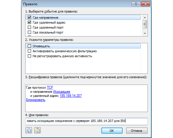 Создадим правило, запрещающее программе Internet Explorer доступ к серверу с данным IP-адресом (рисунок 2.13).