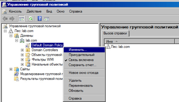 Развернем вкладку нашего домена, найдем политику Default Domain Policy. Нажмем правую клавишу мыши на нее и выберем пункт изменить (рисунок 3.2).