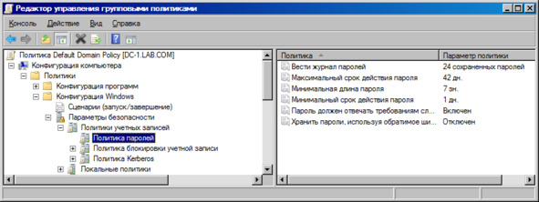 Политики паролей находятся в следующем разделе редактора GPO: Конфигурация компьютера – Конфигурация Windows – Параметры безопасности – Политики учетных записей – Политика паролей (рисунок 3.3).