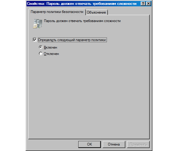 По заданию необходимо запретить «простые» с точки зрения безопасности пароли. Для этого включим параметр политики «Пароль должен отвечать требованиям сложности» (рисунок 3.4).