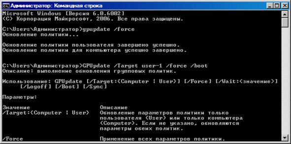 Чтобы принудительно выполнить фоновое обновление всех параметров групповой политики, независимо от того, изменились ли они, воспользуемся командой gpupdate /force (рисунок 3.5).