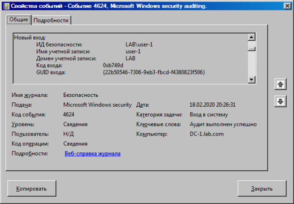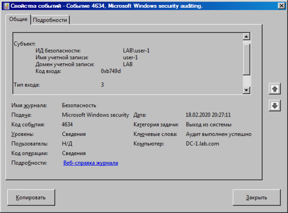Выполним успешную попытку входа с PC-1 под учетной записью user-1, которая была создана ранее. В журнале появляется запись о событии входа, где указана дата, время, пользователь и ПК (рисунок 4.6).