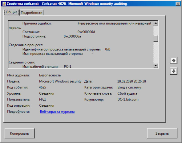 Рисунок 4.7 – Событие при неудачном входе в систему