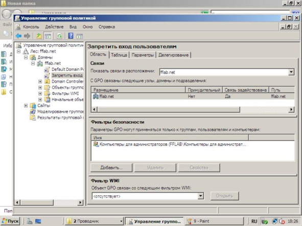 В настоящей сети для применения политик лучше пользоваться группами, а не применять политики ко всем пользователям/компьютерам домена.