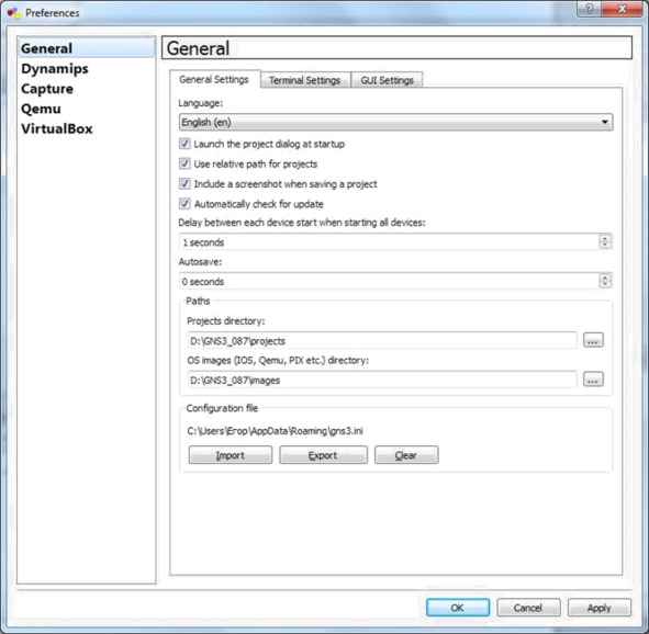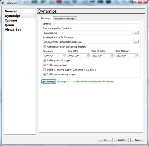 Пропишем директории к файлам Dynamips и протестируем работу.