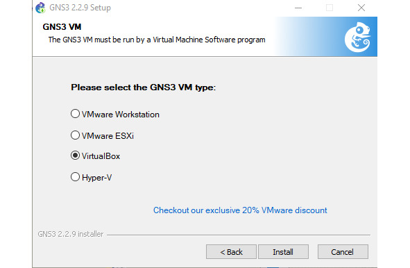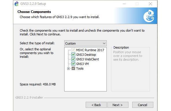 Далее последует лицензионное соглашение, с которым необходимо согласиться и указание папки стартового меню. Затем будет предложено выбрать, какое программное обеспечение, с вязанное с GNS3 нужно установить. Помимо самого GNS3 можно установить GNS3 Веб-клиент, а также GNS3 виртуальную машину.