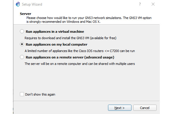 При запуске программы появится окно с выбором местонахождения сервера, за счет ресурсов которого будет происходить симуляция сети. На выбор дается виртуальная машина, личный компьютер и удаленный сервер