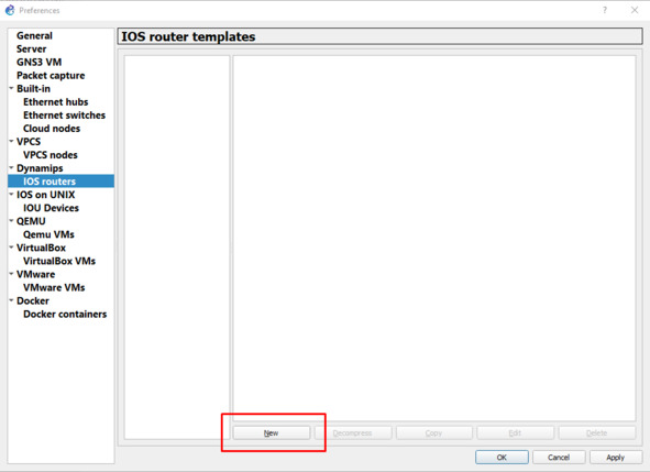 Через меню настроек (Edit> Preferences) нужно загрузить образ роутера, который будет использоваться в работе (c7200-adventerprisek9-mz.150—1.M). Для этого следует перейти во вкладку Dynamips, IOS routers и нажать на кнопку «New».
