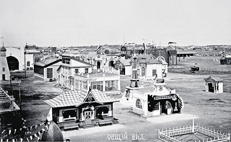 Панорама Первой Западно-Сибирской выставки. На переднем плане – павильон компании «Зингер», стилизованный под швейную машину. За ним – реплика Эйфелевой башни из ведер и тазов. 1911. ОГИК музей