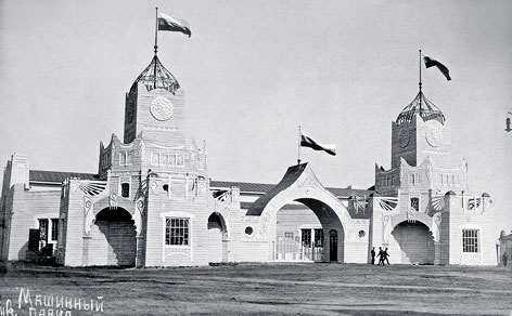 Машинный павильон Первой Западно-Сибирской выставки представлял собой деревянное строение с арками и башнями, увенчанными ажурными металлическими куполами. 1911. ОГИК музей