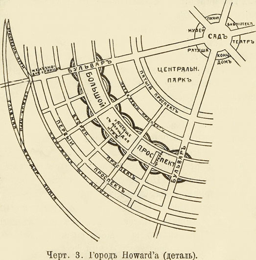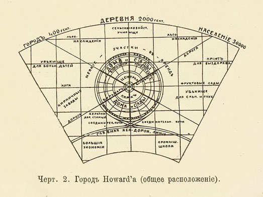 Свои предложения Говард подробно изложил в нашумевшей книге «Завтра: мирный путь к настоящей реформе» (To-morrow: A Peaceful Path to Real Reform), впоследствии переизданной под названием «Города-сады завтрашнего дня» (Garden Cities of To-morrow). Текстовая часть книги сопровождалась схемами-диаграммами, изображавшими город-сад в виде поселения с идеальной радиально-кольцевой планировкой. Эти диаграммы были восприняты русскими архитекторами буквально, т. е. как готовый градостроительный проект[13]. Именно поэтому многие отечественные планы городов-садов имеют строго геометрическую круговую структуру с лучевыми магистралями, в то время как на Западе, особенно в англо-американском градостроительстве, чаще использовалась более свободная планировка с криволинейными улицами.