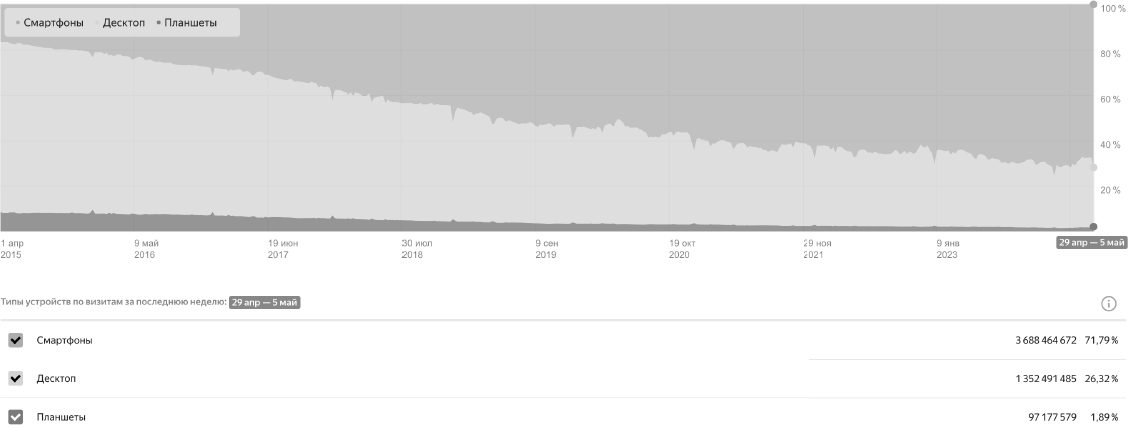 Рис. 1. Динамика распределения трафика по типам устройств. Источник: https://radar.yandex.ru/