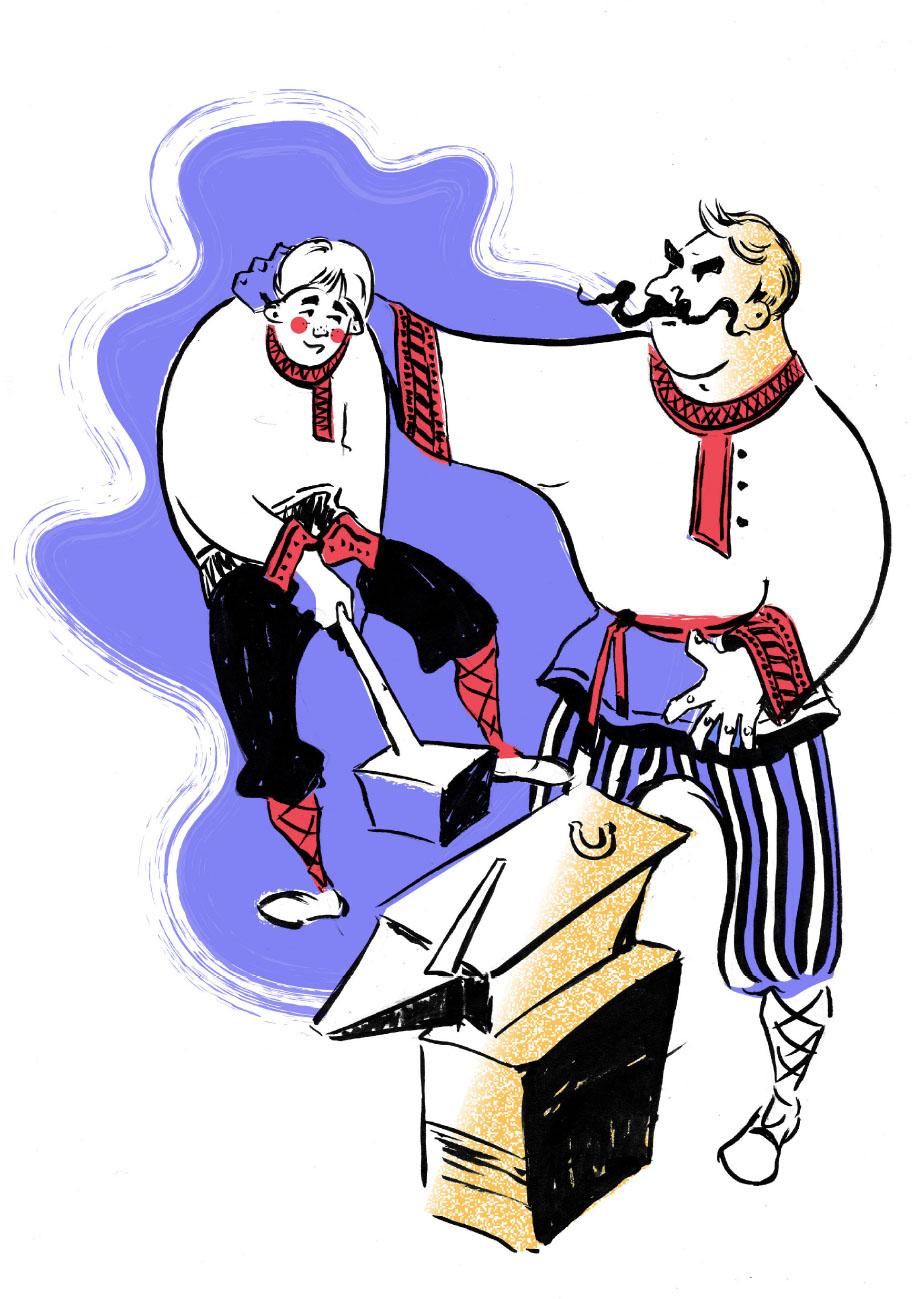 Пустился на авось Михей: взял проковырял шилом по обе стороны, где лопнуло, еще по дырке порядочной, просунул туда бечеву насмоленную и давай затягивать… Стянул в кучу, где лопнуло, а где снова проковырял, там еще разорвал. Видит Михей – дело плохо, не по его разуму, струхнул, и жене не показывает, хоть той и очень хотелось бы посмотреть, как муж боярские сапоги чинит. Вот Михей, расковыряв сапог, взял поскорей вару, черной смолы и ну замазывать… Заклеил и дырки, и бечеву, насадил лепешку в полсапога и так отделал его, что и самому страх смотреть… Поставил под лавку и говорит жене: «Смотри, завтра придут за сапогом, отдай его. Скажи, мол, совсем готов, и за работу погоди просить, а слушай, что служитель станет говорить. Если не понравится что, скажи, меня дома нет, в лес по дрова пошел».