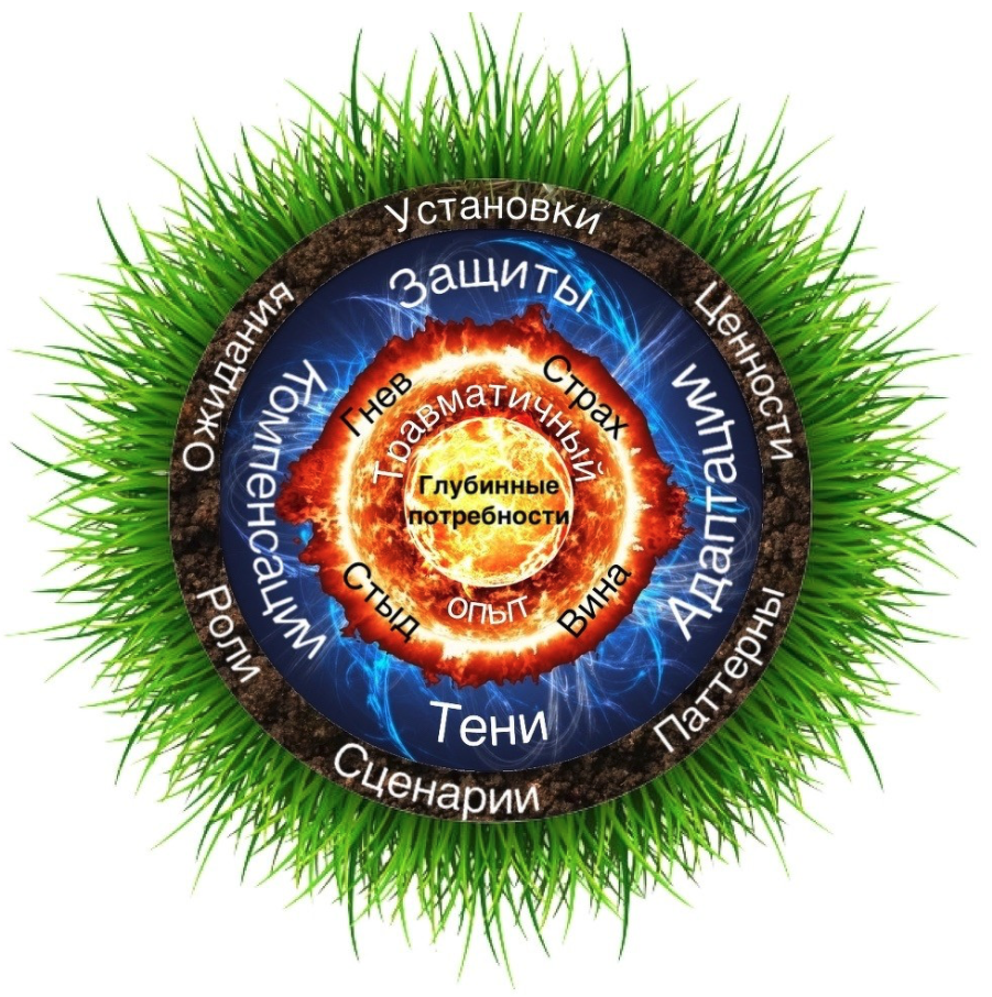 В настоящий момент известны сотни моделей мышления и поведения, сознания и подсознания. Данная схема условна, не претендует на истинность, а служит упрощенной, обобщающей моделью исключительно для удобства иллюстрации. Она показывает, как формируется психологическое ядро любого человека. И если свести к одному абзацу более чем вековую историю психотерапии (да простят меня профессионалы), общая идея заключается в том, что каждый из нас в силу своей уникальной комбинации травматичного опыта (воспитания, культуры, случайностей, драматичных событий, лишений и т. д.) не может во всей полноте реализовать свои глубинные потребности, испытывает по этому поводу всевозможные неприятные эмоции и переживания, а стараясь защититься от них, научается скрывать это, маскировать и компенсировать чем-то поверх. Каждый – как-то по-своему. Но каждый. И в результате у нас формируются столь же индивидуальные жизненные сценарии, установки, ценности и так далее. А благодаря им мы действуем – множество решений и активностей на картинке изображены в виде травы.
