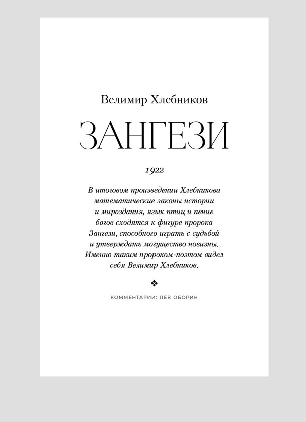 Как она была опубликована?«Зангези» вышла сразу отдельной книгой в июле 1922 года – автор не дожил до издания нескольких недель. Тираж не был оплачен, и типография чуть не пустила его на макулатуру: книгу спасло вмешательство наркома просвещения Анатолия Луначарского[71]. Впоследствии сверхповесть переиздавалась в собраниях сочинений Хлебникова начиная с 1931 года; первое переиздание было сделано по рукописи с учётом хлебниковской корректуры 1922 года и замечаний художника Петра Митурича, близкого друга Хлебникова и оформителя первого издания. В 2021 году, к 135-летию Хлебникова, отдельной книгой вышло первое научное издание произведения, предлагающее его новую текстологию (в частности, отказ от принятой ранее нумерации плоскостей): в эту книгу, подготовленную Андреем Россомахиным, вошли комментарии к произведению, новые исследования о нём, история публикации «Зангези» и предпринятой Владимиром Татлиным театральной постановки, отзывы современников и обширный иллюстративный материал.