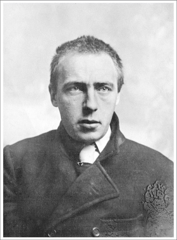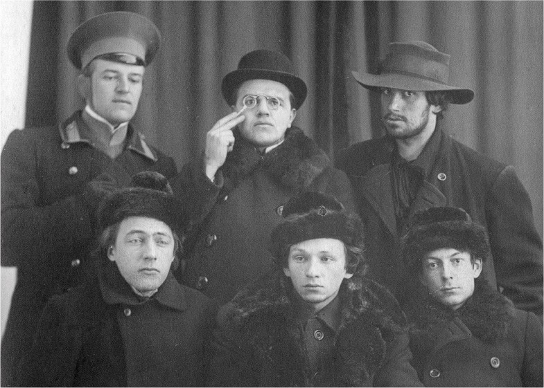 Сидят (слева направо): Велимир Хлебников, Григорий Кузьмин, Сергей Долинский. Стоят (слева направо): Николай Бурлюк, Давид Бурлюк и Владимир Маяковский. 1912 год[69]