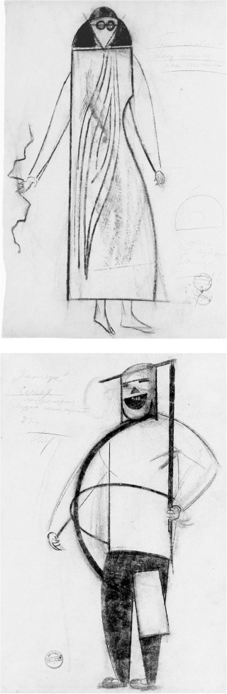Эскизы костюмов Горя и Смеха, сделанных Владимиром Татлиным к спектаклю «Зангези». 1923 год[74]