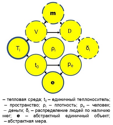 Теплоноситель в природе и человек в обществе служат наименьшей единицей, из разного количества которых образуются структурные элементы. Пространство в природе и деньги в сознательной деятельности являются абстрактной мерой, используемой в структурообразовании того и другого. Если в естественных системах образуются свойства плотности, как соотношение количества теплоносителей к пространству и разреженности, как обратного соотношения, то и в экономике тоже существуют такие же свойства, характеризующие количество людей в денежном пространстве и соотношение количества денег, приходящихся на одного человека.