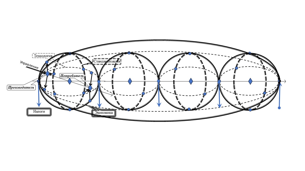 Стрелками показано то, что может продать продавец и купить покупатель. Стрелки в окружностях представляют отношения к законам. Точки на стрелках разделяют фазовые состояния. Классификация проблем сделана в соответствии со своими аналогиями в механике. Объекты имеет вида обмена на трех уровнях: энергией, силой и количеством движения.