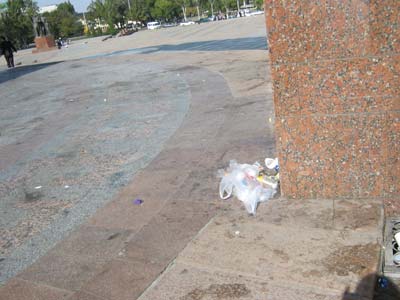 По природной наивности я рассчитывал, что на следующее утро весь сор уберут, а мрамор вымоют. Ничего подобного. Площадка вокруг Вечного огня продолжает обрастать толстым слоем грязи.