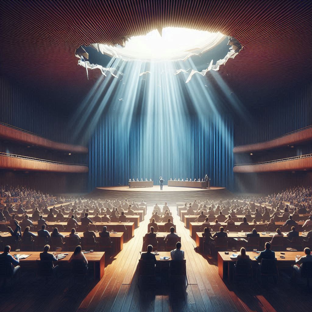 Конференция проходила в Доме культуры в одном из пригородов Бишкека. Здание было очень старым. Кое-где отсутствовала крыша, и большинство окон треснуло. Электричество давно отрезали. Но благодаря дырам в потолке помещение было неплохо освещено.