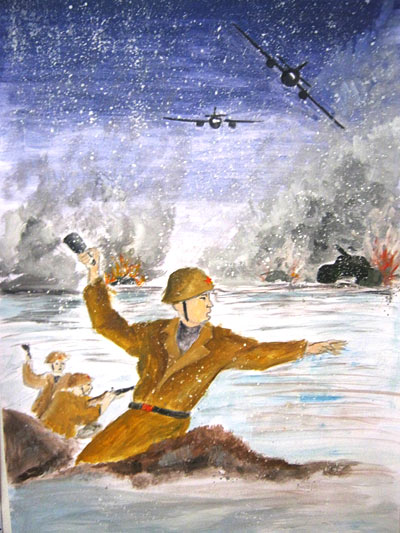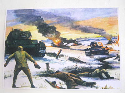 Картины войны исполнены переживаний. Горят пулемёты и танки, из окопа выглядывает одинокий солдат. Держит в руках гранату. Сейчас швырнет её из последних сил и падёт ниц. Рядом отряд с гранатомётами отдыхает на зелёной полянке. А вот живописный рисунок с изображением зимнего боя. В воздухе кружат снежинки, падая на окроплённую кровью землю. Пылают «Тигры», лежат поверженные немцы.