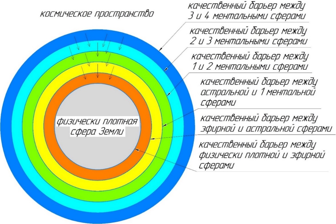 Ускорение свободного падения есть ничто иное как ускорение, приобретаемое как результат действия силы прижатия слоями атмосферы (пятью материальными сферами, вложенными одна в другую) материально плотного тела к поверхности планеты (рисунок 1). Действующие силы направлены по перепаду мерности L от большего уровня мерности к меньшему: