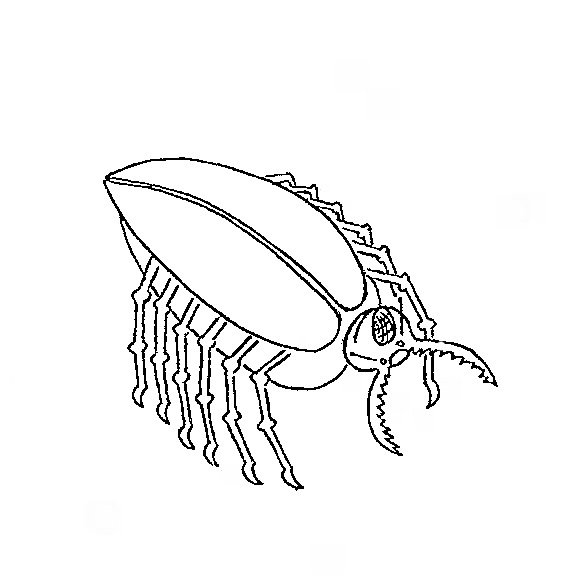 И вот из прохода появилось нечто. Существо передвигалось короткими перебежками, ловко перебирая целыми шестью парами двухсуставных конечностей! Каждая конечность заканчивалась когтем размером с человеческую ладонь, при движении существо издавало перестук, цокая когтями по каменистому полу пещеры. Овальное, покрытое короткой мохнатой шерстью туловище существа, располагавшееся горизонтально, напоминало туго набитый мешок метра полтора длиной и было прикрыто сверху двумя продолговатыми пластинами по всей длине. Голова существа, друзья ее тоже хорошо разглядели с такого расстояния, состояла фактически из трех элементов: собственно черепной коробки с двумя вертикально расположенными усиками (по всей видимости, исполнявшими роль чувствительных антенн), огромных изогнутых челюстей в виде серпов и единственного глаза над ними размером с блюдце. Свет фонаря как раз и отражался от сетчатой структуры глаза. Глаз существа приходился человеку среднего роста примерно на уровне груди. Такой вот не то жук, не то паук, не то таракан размером с теленка!