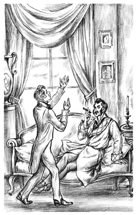 Петр Иваныч при этом монологе значительно поднял брови и пристально посмотрел на племянника. Тот остановился.