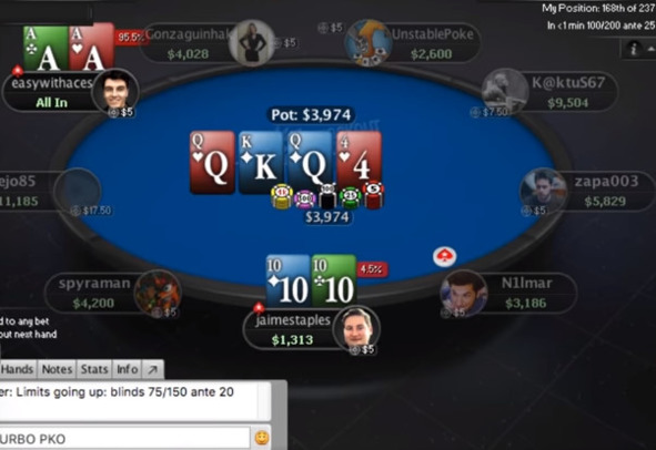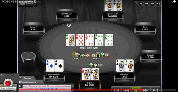 У одного пара АА, у другого пара КК, у третьего игрока пара QQ, и у четвертого пара JJ, выиграть в такой ситуации очень тяжело! В онлайн такое бывает очень редко, но бывает, так же об этом можно сказать, и в реальной игре, такое бывает, но очень редко, все же бывает!