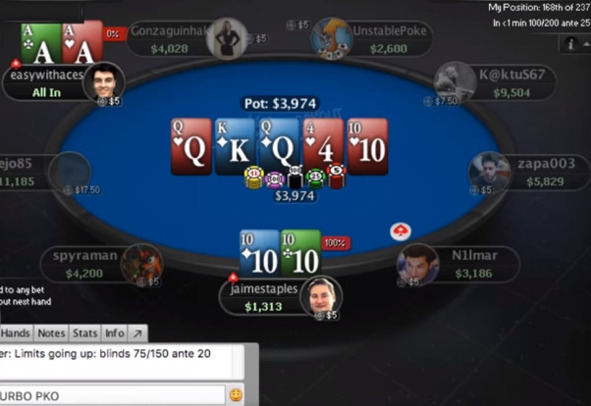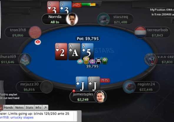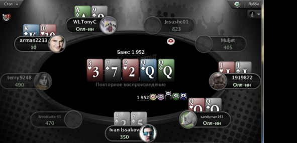 Допустим у вас па 1010 и вы решили пойти в Олл – ин, и тут бац ваш соперник тоже решил открыться. А у него два АА, Да очень обидно в начале, но посмотрим, что произойдет дальше!