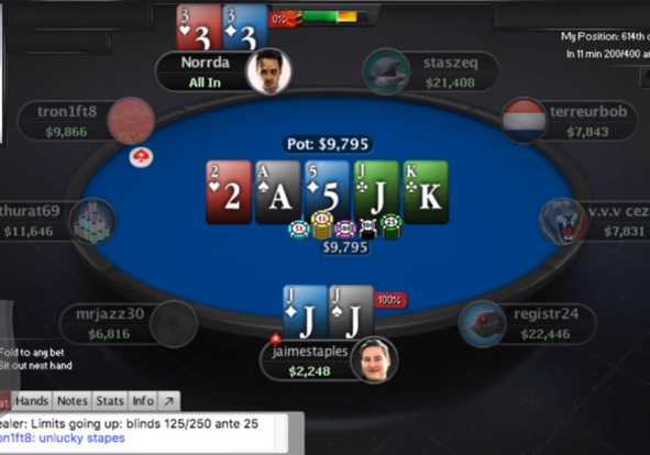 К вам на руки пришла пара JJ, можно с уверенностью пойти в Олл-ин. Один соперник вас поддержал, и вы выставляетесь, всегда очень приятно видеть в таком случаи, что вы сильнее соперника.