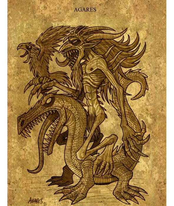 Агарес, в большинстве случаев ему нравится принимать обличие приятного старика, который медленно передвигается на крокодиле, а на руке восседает у него ястреб, Агарес возвращает беглецов, учит всем языкам мира, умеет вызывать землетрясение, он командует около 31 легионов духов. Такая армия всех демонов может вступить лишь тогда, когда вступит на землю Люцифер, и тогда все демоны до единого, вырвутся на землю.