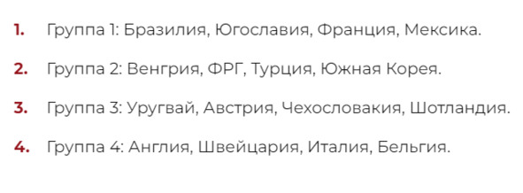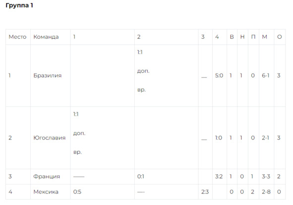 Естественно в этой группе досталось два места это сборной Бразилии и Югославии. Где победили Францию и Мексику!