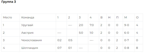 Эта была пожалуй самая простая группа из всех! Уругвай и Австрия не играли между собой! А сборная Чехословакии и Шотландии сыграли с сухим счетом!